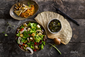 Mezclum de hojas frescas, mix de vegetales, palta, choclo, tomates cherry, quinoa y champiñones, con langostinos en tempura, salmón rosado y pescado blanco en masa crocante japonesa.