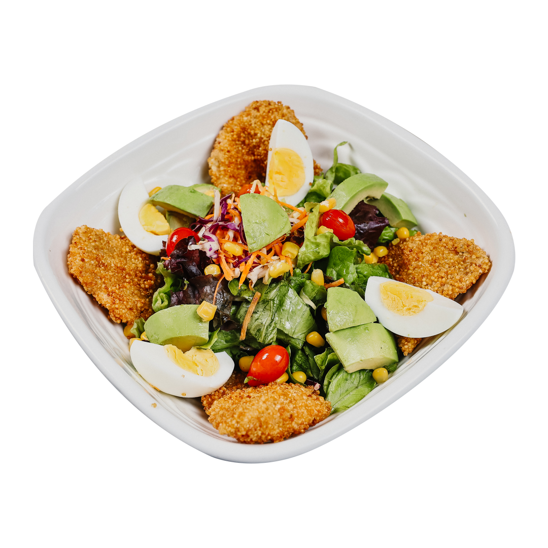 Mix de hojas verdes, bastones de pollo rebozados con quinoa, tomate confitado, palta, huevo y choclo.